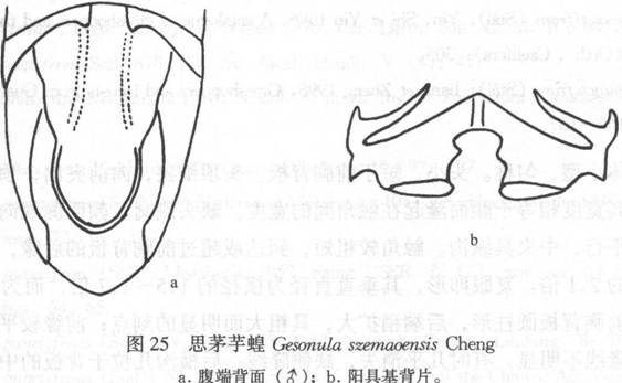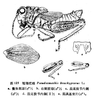 (图125a)。头顶宽阔,向前倾斜,两侧缘隆线明显,具较细的颗粒状突起。颜面隆起上的纵沟较深。复眼较突出,近似球形。触角较长,远超过前胸背板的后缘。前胸背板前缘明显向前突出呈角状,后缘近于直角形;具较小的颗粒状突起...