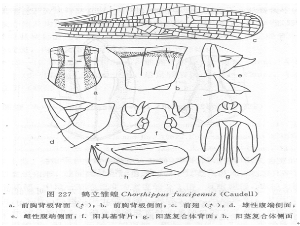 近似,雌雄两性前胸背板侧隆线在沟前区呈弧形弯曲。雄性前翅超过后足股节顶端,亚前缘脉域相等或宽于前缘脉域,径脉域较狭,径脉域在径脉分枝处的宽度明显狭于亚前缘脉域的宽度,亚前缘脉稍弯曲。雌性前翅较短,不到达或刚到达后足股节的顶端。雄性后足股节内侧具音齿1...