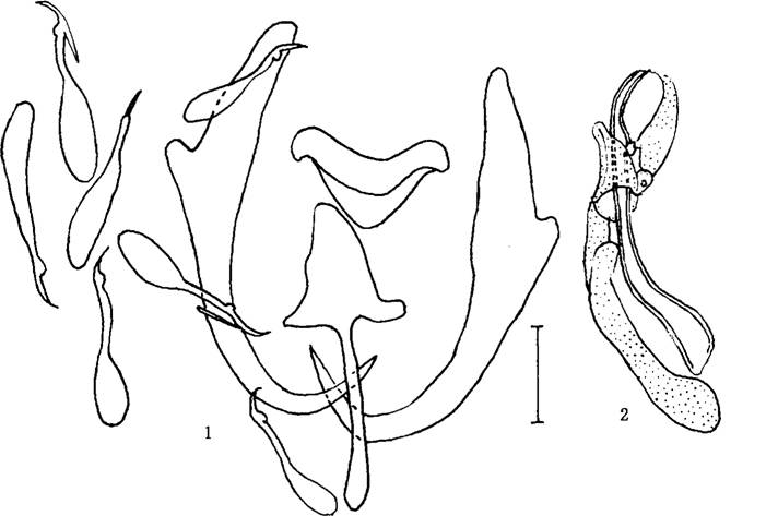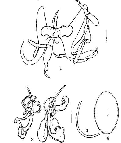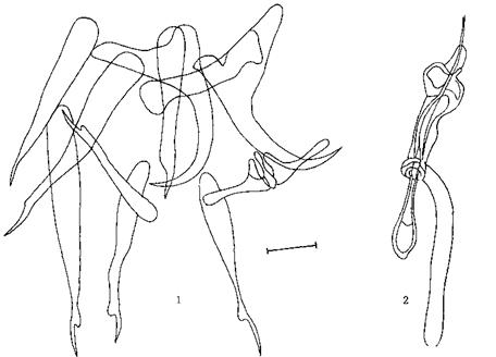 0.24-0.38mm,宽0.049—0.074mm 。后吸器具2联结片。边缘小钩分柄、柄轴和钩尖基突三部分,
