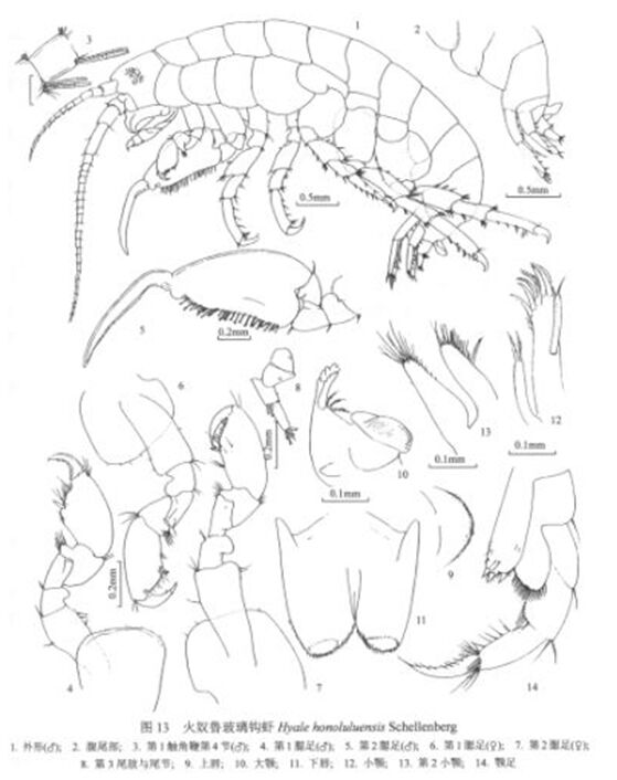 第1触角短,仅为第2触角长度的1/2或稍短,柄部短,鞭8—13节,中部鞭节具感觉刚毛,无附鞭。第2触角较长,柄部...