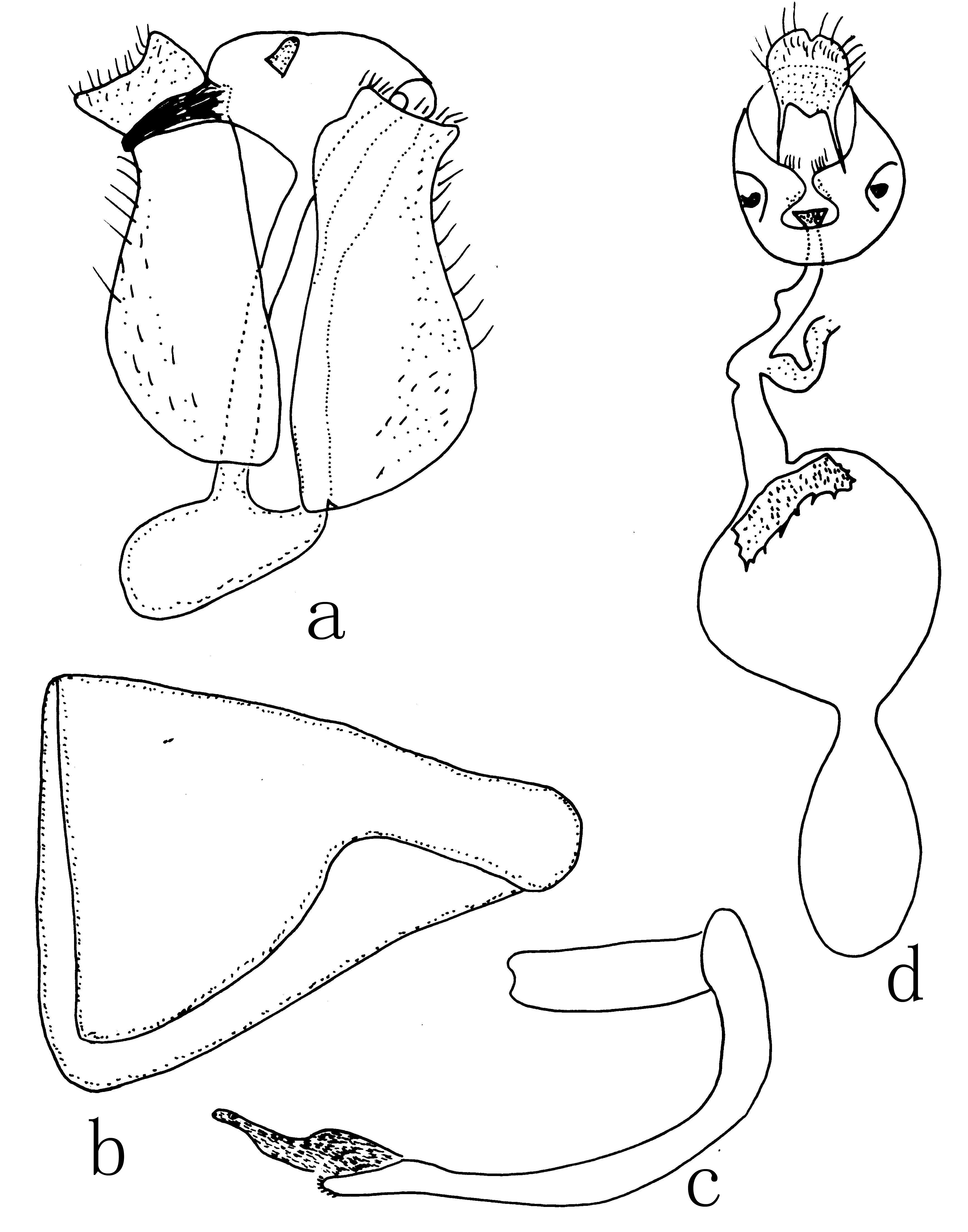 红色毛;足毛黑褐色,仅中足胫节内侧及跗节被红褐色毛。雄性头部无黄
