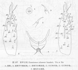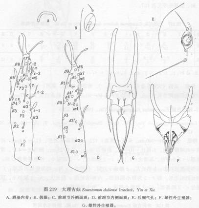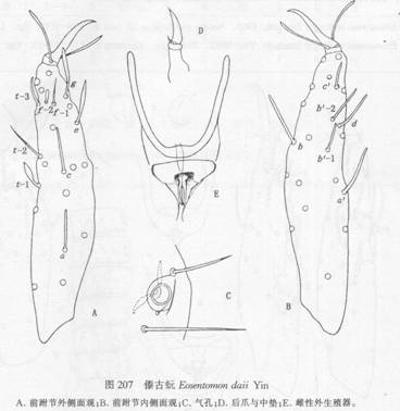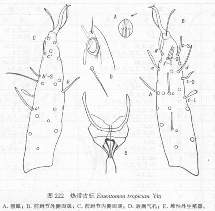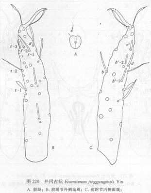 全长900—940μm。头长(侧面)122μm。假眼椭圆形,11μm×8μm,有中隔和中央球形小泡,头眼比=10—11。前跗长96μm,爪长23μm,跗爪比=4.2。背部感觉器t—1小槌形,基端比=1.18;t—2细而长,t—3较短小。外侧感觉器a和c的形状和...