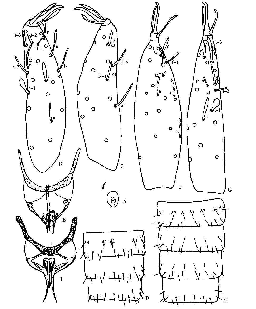 特征:体长800一986μm。头长 96一102μm;假眼长8-12μm,头眼比=12-13。前跗长64-70μm,爪长 10-13μm, 跗爪比=5.4-6.4,中垫长 9-11μm,垫爪比=0.89;基端比=0.9-1.0,外侧面感觉器e和g均为匙形;内侧...