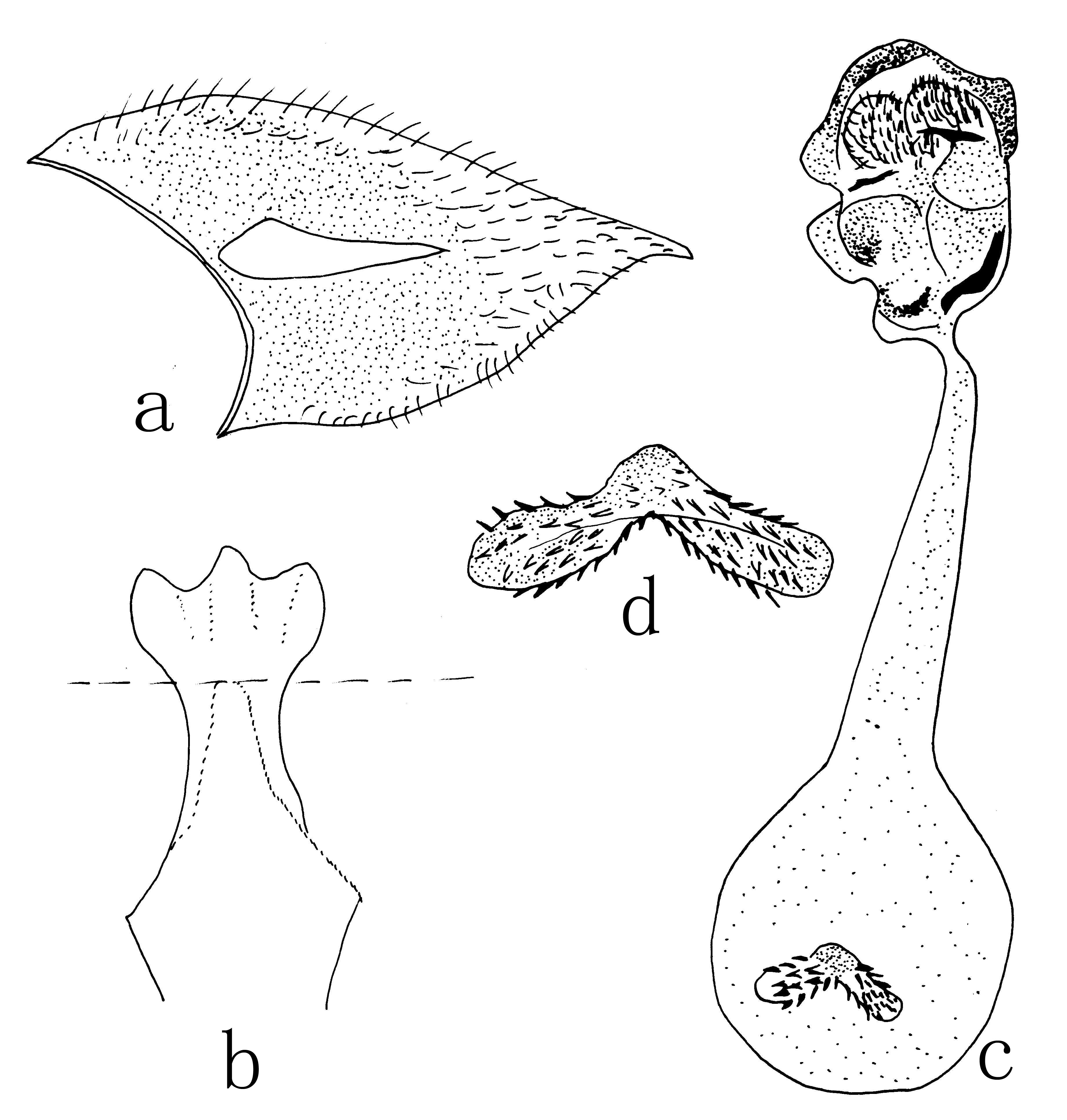 形态 ♂:体长8.5mm。眼密生浅黄色长纤毛;额约为前单眼宽的1.5倍,间额黑,狭如线,侧额和侧颜具银灰白色粉被;下眶鬃达单眼三角,上半部呈小毛状,与下半部的粗鬃界限明显,无上眶鬃;侧颜明显大于触角第三节宽;触角黑,第三节长为宽的2.5倍,触角芒毛等于触角第...
