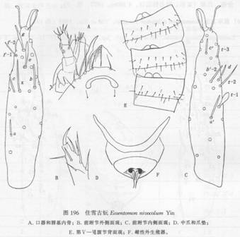 全长1400μm。头长130μm,宽115μm,具明显的弧形唇基内骨,假眼长13μm,头眼比=10。前跗节长92μm,爪长15μm,跗爪比=6。背部感觉器t—1棒槌状,基端比=1.0,t—2细长,t—3长7—8μm。外侧感觉器a较细而短,b较粗大,c与d长度相...