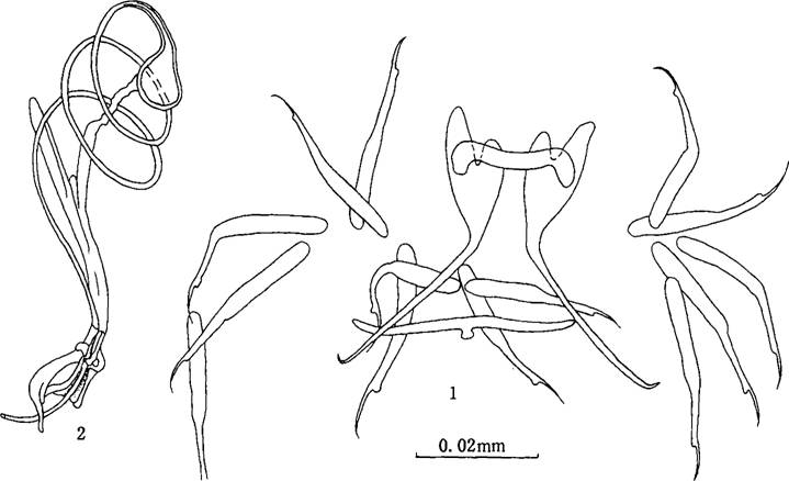 后吸器具二联结片。边缘小钩明显区分出柄,柄轴,及钩尖基突三部分。其