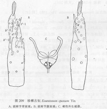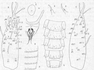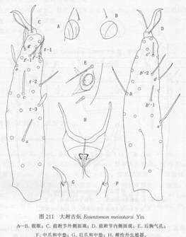 全长1030μm。头96μm×67μm。假眼圆形,直径约10μm。前跗长70μm,爪长约16μm,跗爪比=4.4,垫爪比=0.75。背部感觉器t—1顶部膨大如梨,基端比=1.25。t—2短小尖细,t—3亦较短。外侧感觉器a稍短于c,b较长,d甚长大,e和g匙形...