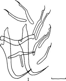 0.24-0.25mm,宽0.098-0.ll3mm 。咽大小0.013—0.019×0.009-0.01 9mm。后吸器与体分界不很明显,大小0.04×0.05mm,具2联结片。边缘小钩