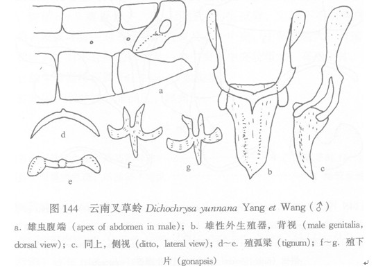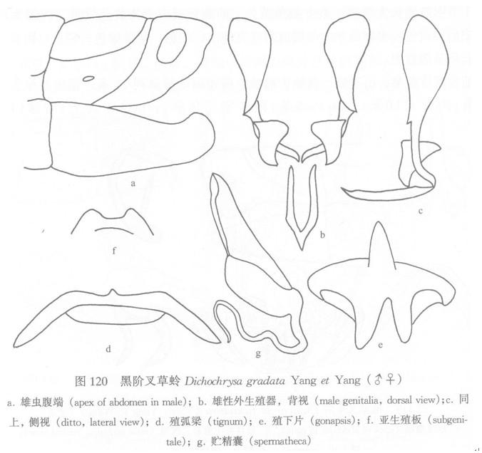 。胸部背面为黄色纵带,两侧黄绿色;足黄绿色;前跗节黄褐色,爪基部弯曲。翅透明。前翅除外阶脉及Psm—Psc间最外...