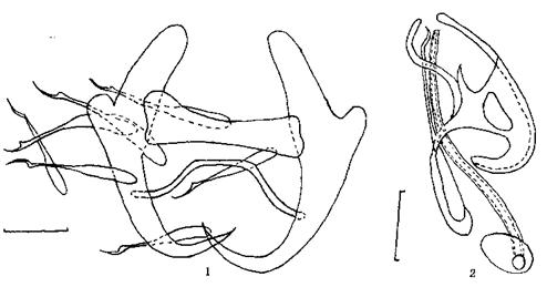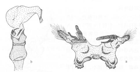 雄性外生殖器 背兜退化;背兜侧突发达,