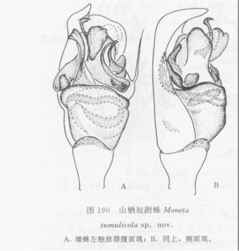 雄蛛体长2.59。头胸部长0.92,宽0.86;腹部长1.65,宽1.02。头胸部近圆形,额部略前伸,较窄。侧眼丘隆起。背甲橙黄色,两侧缘黑褐色,后列眼至中窝之间的中央有一枣核形黑色斑。中窝小,呈“v”字形,其后端有一沟直通背甲的后缘。两眼列均后凹。前中眼间距...