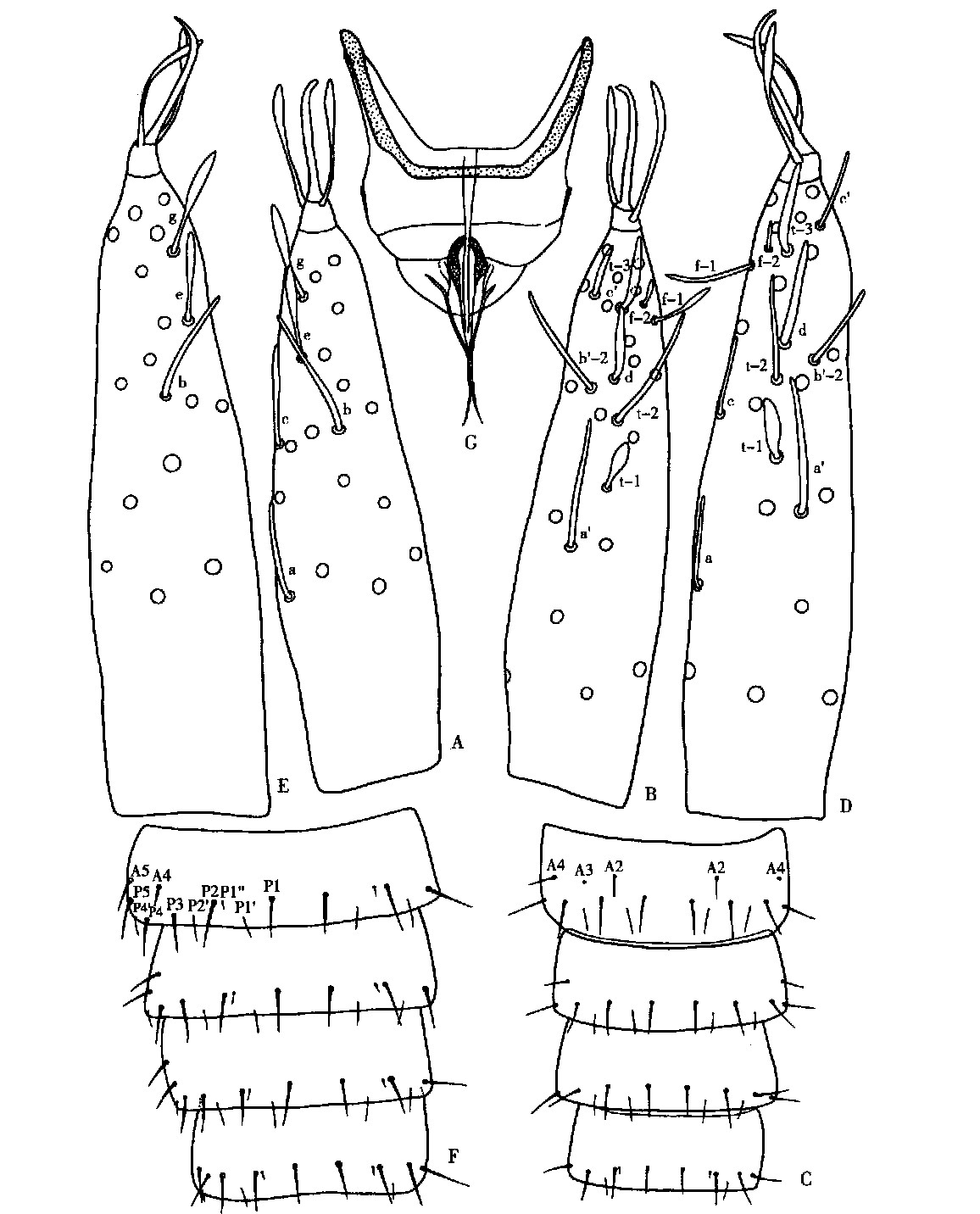 全长1152—1370μm。头长114—119μm,宽99—102μm,上唇刚毛存在,唇基内骨马蹄形。假眼12—13μm×10μm,头眼比=9—10。前跗长98—104μm,爪长17—19μm,跗爪比=5.3—5.8。背面感器t-1纺锤形,位于a3与a3′中间...