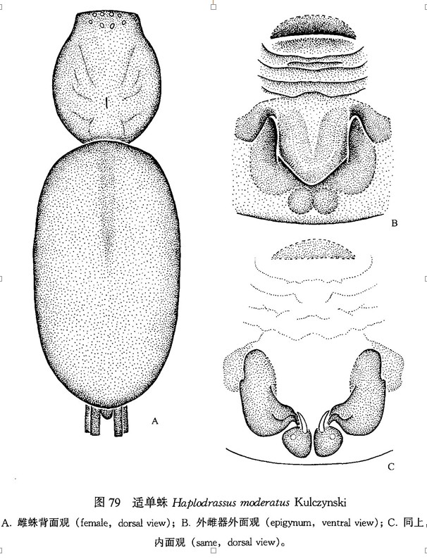 卵圆形,以第Ⅱ、Ⅲ步足基节间为最宽,背甲深棕色,稀疏地被有黑色直立刚毛;头区微抬起,颈沟和放射纹可见;中窝纵向,黑色短棒状。8眼2列,自背面观前眼列稍后凹,后眼列...