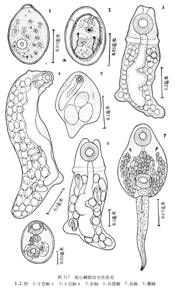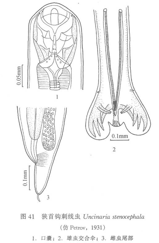 :体长11—12 mm,最大宽度0.60—0.65 mm。交合伞背叶大,2侧叶小,在腹面相联接。伞前乳突细小,2腹肋基部...