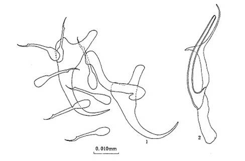 体细小长叶形,两端狭小,体纵轴弯向腹面、体长1.68-1.76,睾丸处