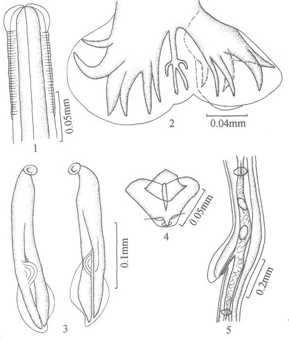 1.头端背面观;2.交合伞背面观;3.交合刺;4.生殖锥;5.雌
