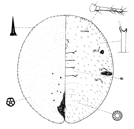体最宽,0.272-0.280。头领发达,宽0.144-0.150,具有头棘24枚,左右腹角棘各4枚排成二列,其余14枚排成一列,背部中央间断,头棘26-28× 8微米。体表棘白头领...