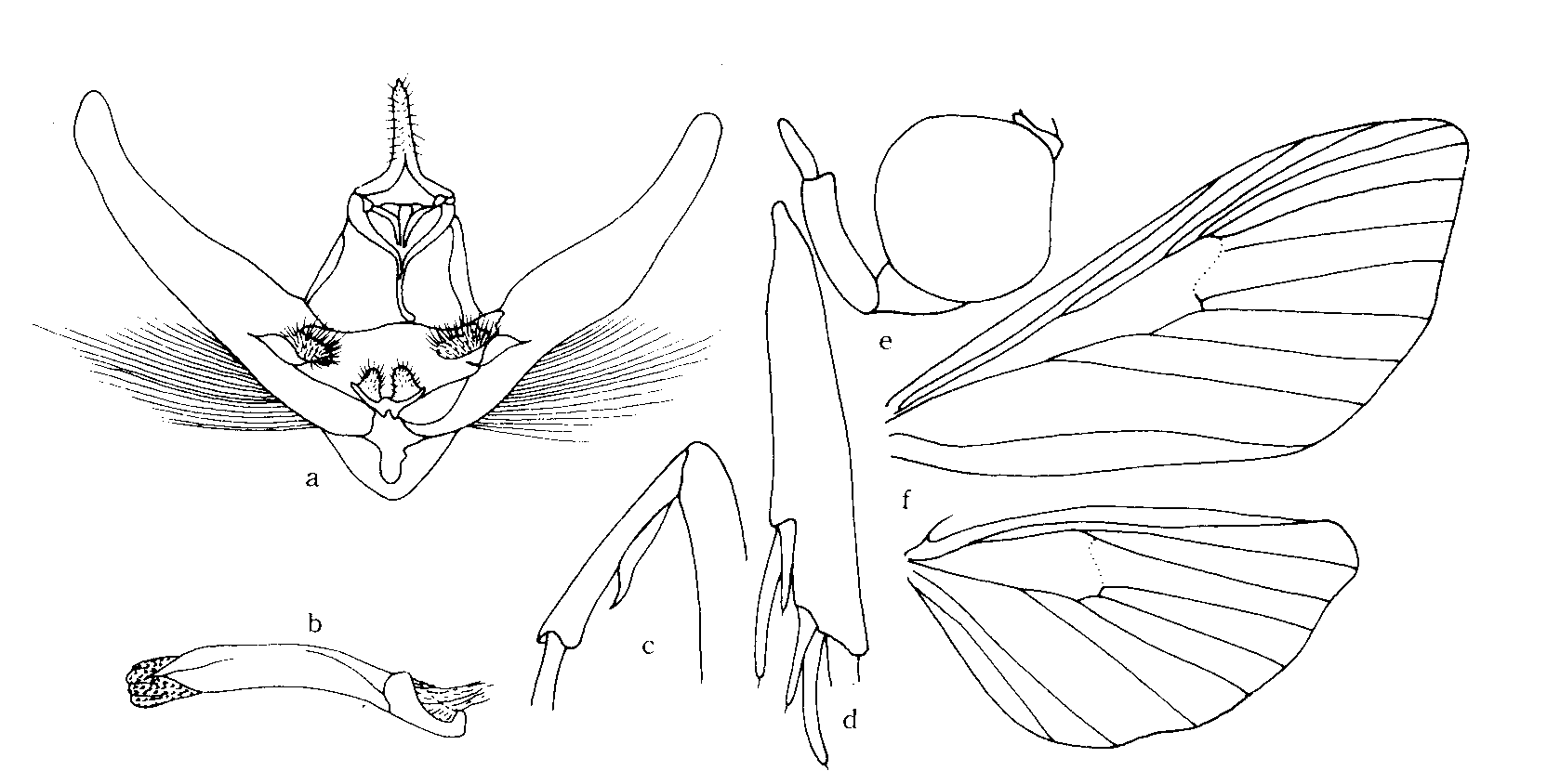 过复眼直径的3倍;浅赭色。胸部灰色。腹部暗栗褐色,后一半腹节灰赭白色,有光泽。前翅接近椭圆形,中部最宽;前缘基部1/3拱出,其余2/3逐渐弯曲,顶角钝;外缘接近圆形;后缘弯曲缓和;翅表面有小竖鳞...