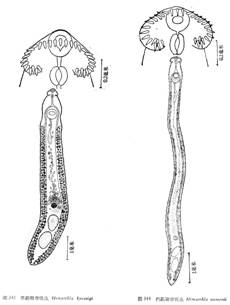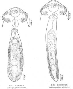体长叶形,体长13.5—20.5,子宫部处体最宽,2.04—2.92。头领小,宽0.774,具有头棘45枚,前后两排相互排列,左右腹角棘各6枚密集,38×17.5毫米,其余33枚排列整齐,76×19....