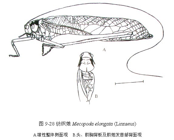 前翅远超过后足股节端部,后翅明显长于前翅。前足胫节内、外距排列为4, 4 (1, 1)型。雄性第10腹节背板后缘具1对狭长的突起;肛上板延长,端部具钩状侧突。雄性尾须侧扁,背缘和腹缘具细齿,端部稍扩宽,内腹侧具一较长的,被棘的刺状突起。雄性下生殖板较短,后缘微...