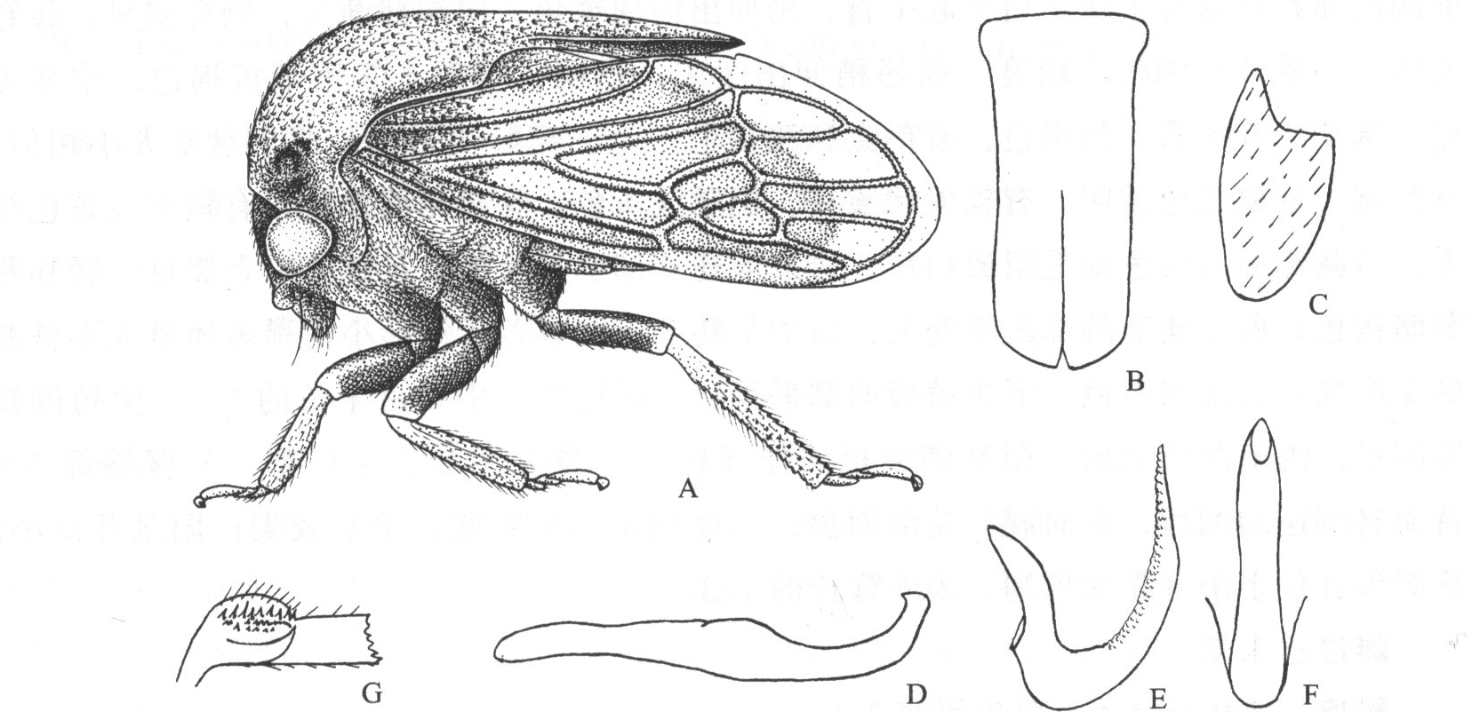 的l.5倍,基缘弓形,下缘倾斜,略呈波状,稍翘起。复眼黑褐色,卵圆形。单眼浅黄色,透明,位于复眼中心联线上方,彼此间的距离等于到复眼的距离。额唇基