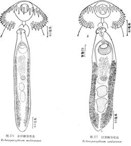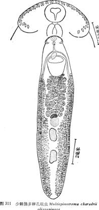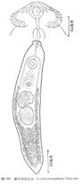 体肥胖长叶形,体前部稍狭,体长9.5—10.2。子宫处最宽,1.68—1.84。 头领发达,宽0.56—0.72,具有头棘35枚,左右腹角棘各5枚密集,下列2枚略小70 X 28微米,上列3枚稍大,87 × 42微米,其余25枚,前...