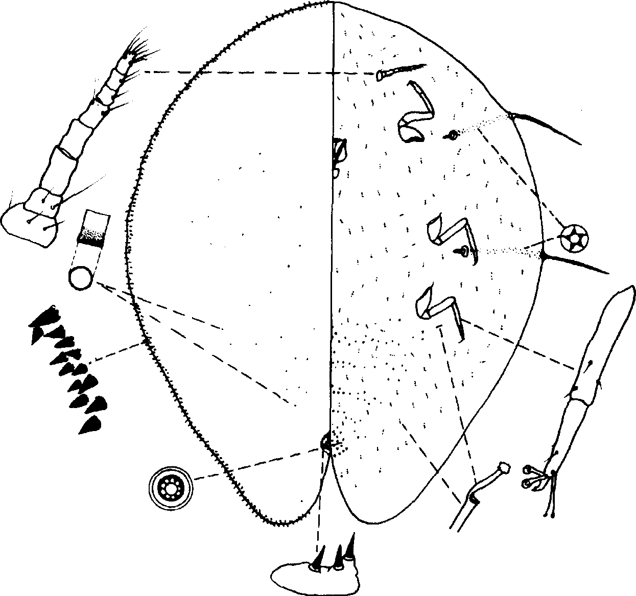 体长约3mm,体最宽处约2mm。触角8节。足具正常节数。跗冠毛纤细,其顶端膨大。爪冠毛粗,其顶端明显膨大。爪前端下表面常具一小齿。多孔腺主要分布在