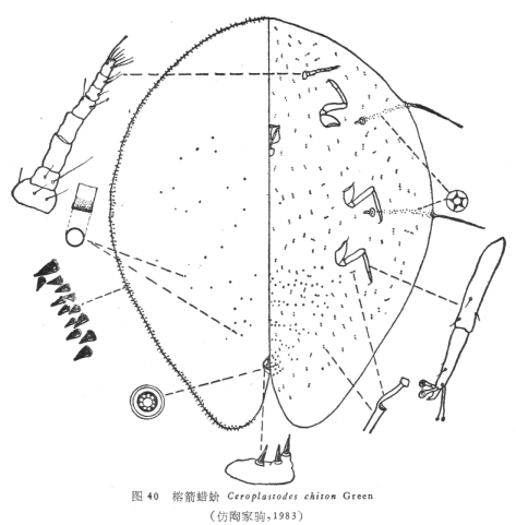 体中部或稍偏向头端。触角扁盘状,其顶端有2根粗刺和2根短小细刺及2根刺毛。模式标本记载,触角...