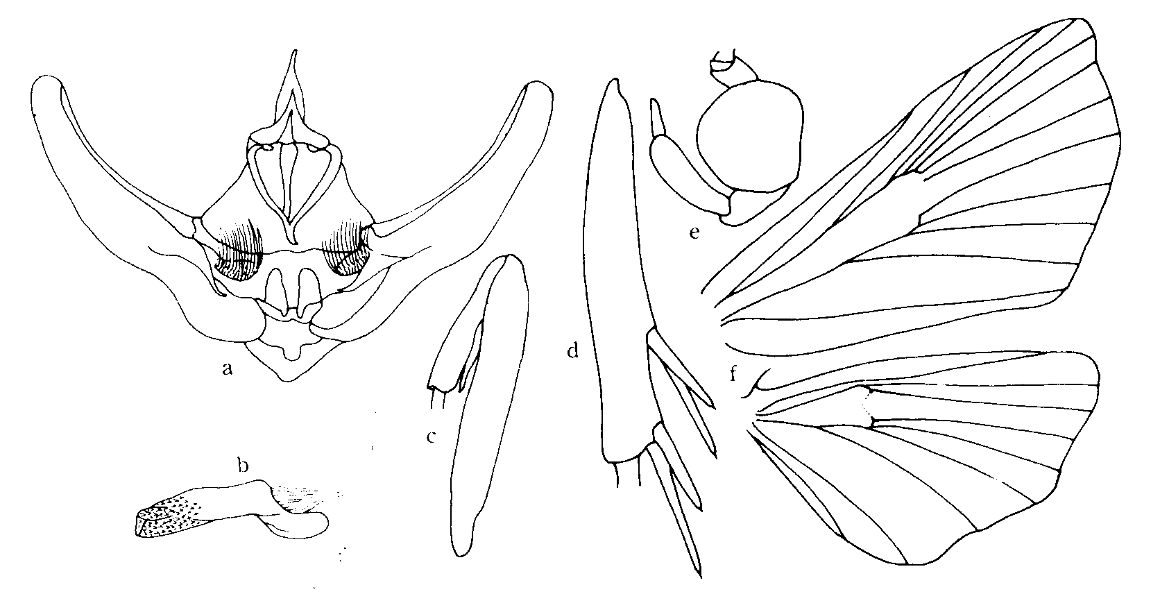 ;中室斑小;中室端斑与臀角纹几乎合并。后翅灰褐色。♂外生殖器(图版XV-1) 爪突垫较短。抱器背钩短宽。抱器瓣宽
