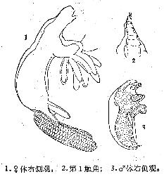 4.5—5.2毫米(包括头胸部,不包括后突起)。头胸部与躯干部大致在一个平面上。躯干部粗壮,末端有一对尾突起及两对后突起。第1触角小,近乎圆锥形,分不明显的4节。第2触角大,内肢两节,末端有两个短刺。小颚的外叶短,有3根刺状毛;内叶