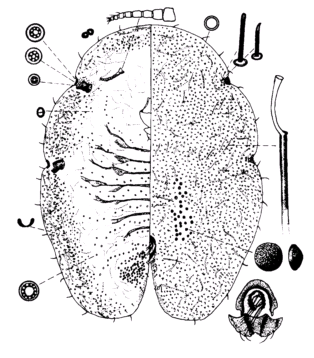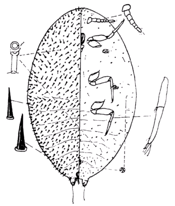 体长约2mm,宽约1.5mm。触角8节,有时7节,如果是7节触角,常为第4和第5触角节合并,触角长约0.18—0.19mm。胸气门发达,气门柄粗。胸气门紧靠