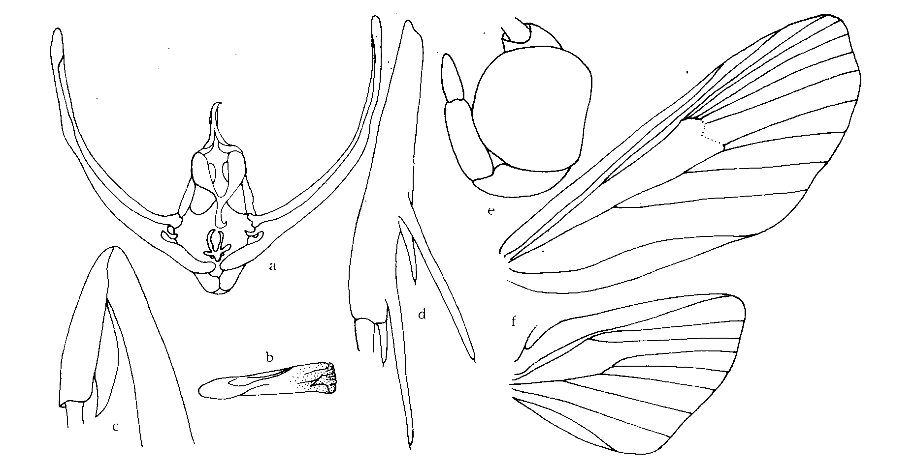 三角形;前缘略凸出;外缘较直,斜向臀角;前缘褶占前缘1/4。前翅淡褐色,有深褐色斑,三角形端纹和中带都很清楚,只是基斑不明显。此外,翅面上还有一些分散深褐色云状斑...