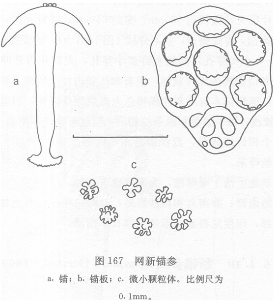 20--150mm,但直径均不超过3mm。触手数目多为10个,少数标本为9个或11个,各具15一17对侧指,各指间有膜相连,波里氏囊12一14个,石管1个。眼点很小,难以分辨。软骨环很钝。石灰环稍带红色。 身体前后端的骨片基本相同,锚形骨片锚...