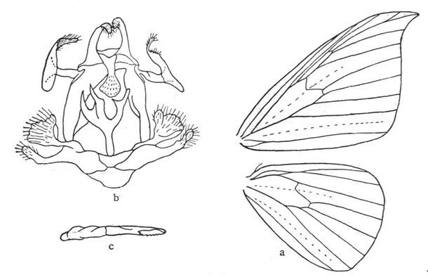 翅展:雄蛾18~24mm,雌蛾26~32mm。下唇须、头部和触角黄褐色,胸部夹杂黄褐色。雄蛾前翅顶端不膨大,中部最宽,前缘基部强烈弯曲,近顶角平直,外缘弧形。前缘褶占前缘2/3,端部最宽。雌蛾在顶角前凹陷,顶角凸出,外缘波状。雄蛾前翅黄褐,有深色横斑,横斑两侧...