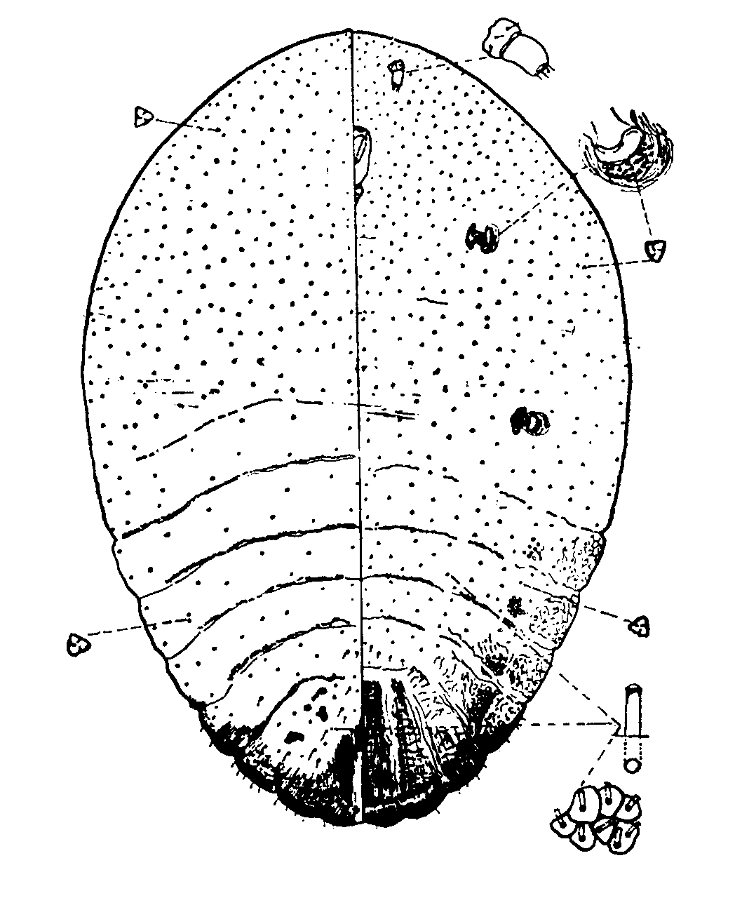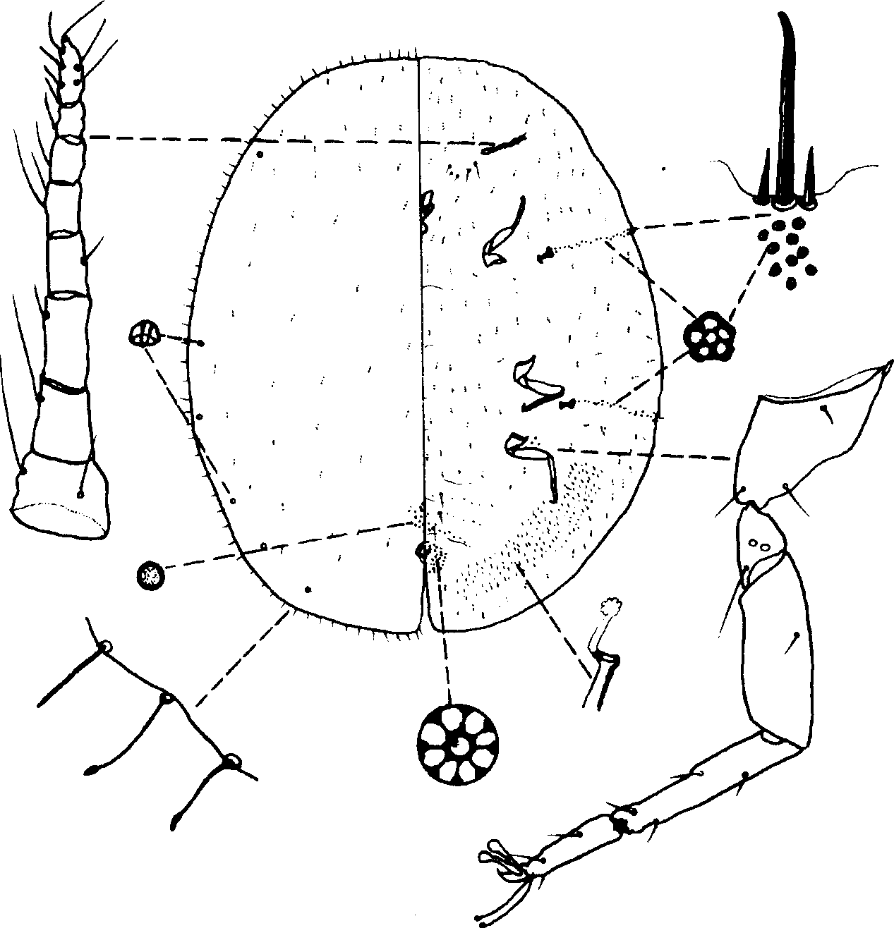 体呈球形。体长约6mm,宽约7mm,高约5.5mm。触角7节,其中第3节最长。胸足正常发育,爪具小齿。胸气门较发达。气门刺与体缘刺无明显差别,体缘刺较发达强劲,长圆锥形,其顶端较尖,且体缘刺间的彼此距离较大。无体缘毛。在肛孔...