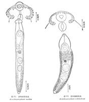 体最宽处在前睾丸与子宫之间,宽1.328—1.510。体表在卵巢前被小棘。 头领肾形,宽0.830—0.813。头棘47枚,角棘2枚重迭排列,背侧棘双行排列,角棘63—84×28微米,背...