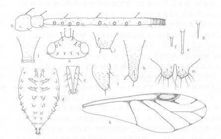 体椭圆形,体长2.13mm,体宽0.95mm。活体淡黄色,体背有4纵行斑。玻片标本身体淡色,足各节、触角、喙、尾片、尾板及生殖板淡色;腹部背片Ⅰ—Ⅷ各有1对中侧斑和1对缘斑,背片Ⅰ—Ⅳ中侧斑