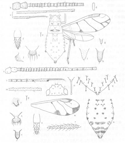 体椭圆形,体长2.71 mm,体宽1.20 mm。活体黄色。玻片标本淡色,触角节Ⅰ、Ⅱ内缘黑色,节Ⅲ全黑色,节Ⅳ—节Ⅴ端部3/5黑色;喙淡色,节Ⅳ—Ⅴ两缘淡褐色,顶端黑色;股节顶端呈角形黑斑,外缘淡褐色,胫节漆黑色,跗节黑...