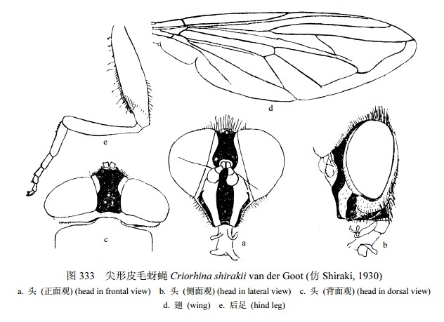 雌性 头顶亮黑色;额中等宽,亮黑色,眼缘覆黄色粉被;颜中突明显,覆黄色粉被,具淡蜡黄褐色宽中条纹和几乎同宽的淡褐色侧条纹。复眼被褐色毛。触角淡褐色,第3节内侧近下缘和几乎在中部具1小洞;芒长褐色,基部黄色。背板淡褐绿色,肩胛、翅后胛覆灰色粉被和适当黄色长毛;...