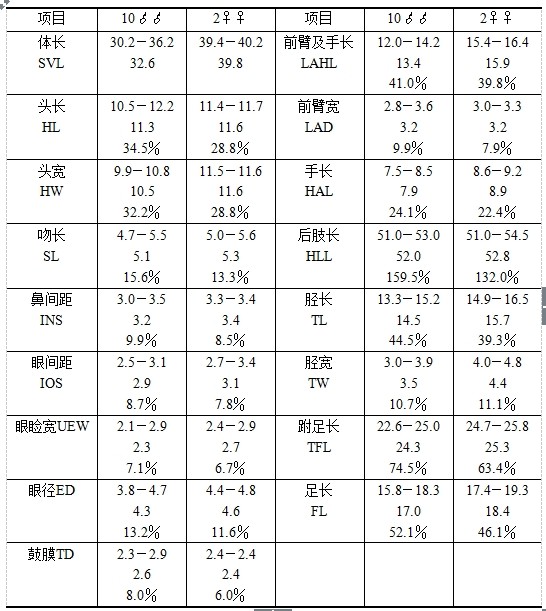 形态 依据辽宁桓仁、吉林集安(70雄、30雌、卵及蝌蚪)标本。