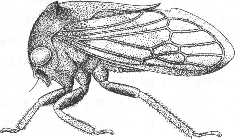 ,密被刻点和金黄毛色,头顶上缘拱起,波曲,下缘褐色,倾斜,波曲。复眼浅黄色,半球形。单眼黄白色,大,位于复眼中心联线上方,彼此间距离大于到复眼的距离。额唇基