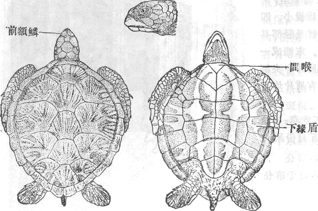 103毫米,宽73毫米,壳高37毫米。头小,其背面平滑;吻端较尖圆,上喙略钩曲;鼓膜小而显;喉部有颗粒状鳞;背甲前后缘呈明显锯齿状;嵴棱三条,正中者平宽,两侧细短;第一枚缘盾最大、缘盾边缘略向上翘。腹甲前缘平切、后缘缺刻深;甲桥明显,无腋盾及胯盾。前