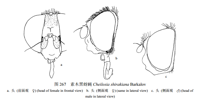 雄性 头顶平,具黑色和白色长毛,单眼三角呈等边三角形;额微鼓起,毛黑色中间光亮,两侧被粉被;颜明显长,光亮;中突较突出;眼缘适当宽,被灰粉被和短白毛;颊被少量灰粉被和白毛;新月片暗褐色;触角窝明显分开。复眼密被白色毛,两眼连接角近90o,其连接线明显较额长。...