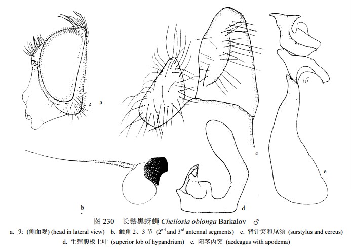 雄性 额非常隆起,被黑色长毛;颜宽于1/3头宽;眼缘宽;单眼三角为等腰三角形。中胸背板暗青铜色,具光泽,被很长的黑色直立毛,两侧毛较粗壮;小盾片被毛同中胸背板,具鬃;侧板被黄色长毛。腹部亮青铜色;第2、3节前半部紫黑色,被中等长的直立黄色毛,第3、4节后面黑...