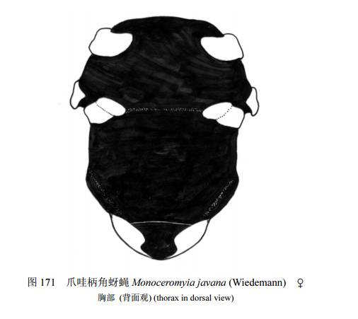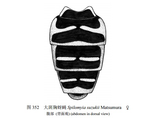 雄性 头顶亮黑色,前部密覆黄白色粉被;额棕黄色,覆与头顶同色的粉被,额前部裸;颜黄色,正中黑纵条短,轮廓不明显;头部除头顶、额两侧及颜上部被黑色毛外,其余均被黄色毛。触角棕红色,第3节色暗。中胸背板黑色,肩胛及其内侧近前缘、以及盾沟两端各具1对圆形黄斑,盾沟...
