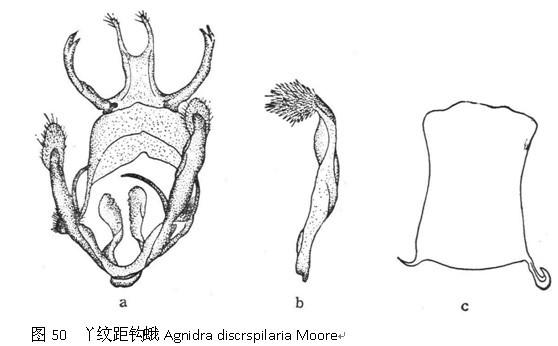 ,棕褐色;触角黄褐色,雄性3/5处双栉形,上部鞭形,雌性单栉;身体背面褐色,腹面黄褐色,胸足褐色。翅褐色,内线细齿状,棕赭色,外线及亚外缘线呈点列,棕褐色,中室内上侧有两个褐色小圆点,下侧端有一个棕黑...