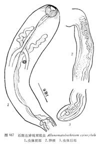 成虫形态(图467) 虫体外有包囊,囊为球形,直径6—8,呈灰白色。 每囊内有虫2—4个。虫体线形,很