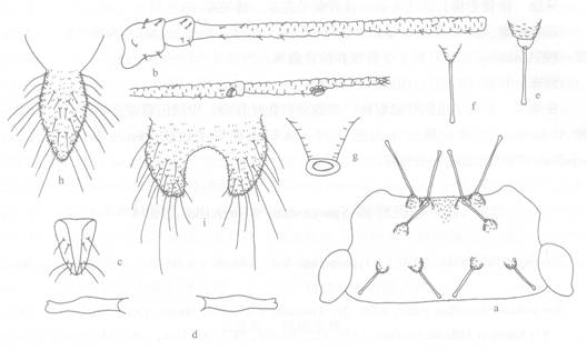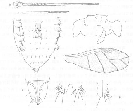 额瘤不明显。触角6节,节Ⅲ基半有圆形次生感觉圈6—10个,排成一列;原生感觉圈有睫毛;节Ⅲ最长,节Ⅳ、Ⅴ、Ⅵ次之,触角末节鞭部稍短于该节基部。喙端达前足基节。前翅翅痣与翅脉有褐色翅昙,径分脉不完整,中脉分为3支;后翅2斜脉...