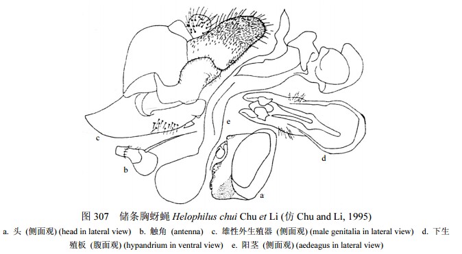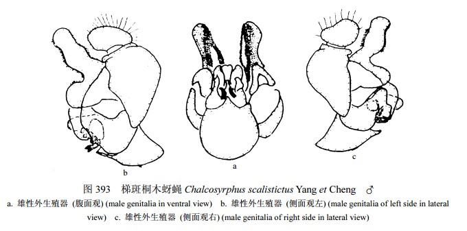 雄性 头顶三角黑色,密覆淡粉被,单眼三角前粉被黄色,密,单眼着生很后;额及颜黄色,额两侧及颜密覆黄粉被。触角基部2节黄褐色,第3节黄色;芒同色。中胸背板黑色,被淡色毛和粉被;小盾片和侧板同背板,小盾片被毛少。腹部黑色,中部略收缩,第2、3节交界处最窄,第2、...