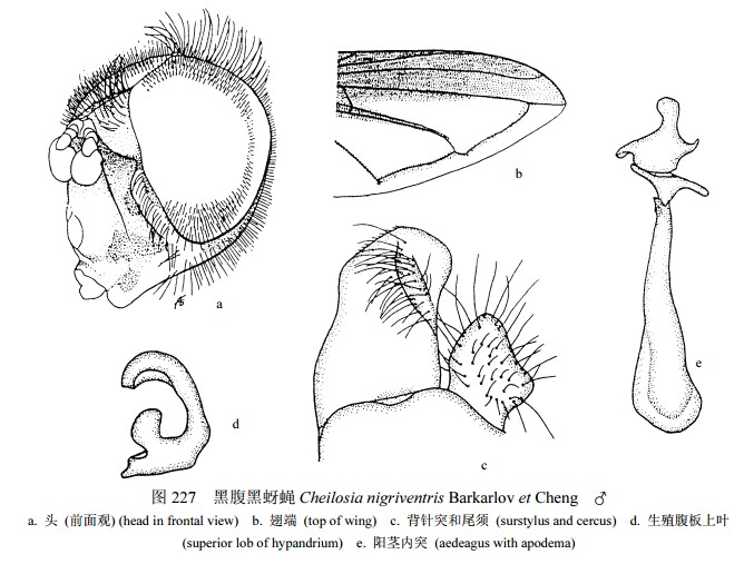 雄性 头顶黑色,单眼三角着生较后,单眼前覆黄褐色粉被;额黑色,两侧沿眼缘覆黄白色粉被,额突前方正中裸,光亮;颜和颊黄色;后头黑色,略覆灰黄色粉被和黄毛。触角基部2节黄褐色,第3节黄色;芒黑褐色。中胸背板黑色,光亮,密被黄色直立短毛,肩胛黄色,其内侧覆黄白色粉...